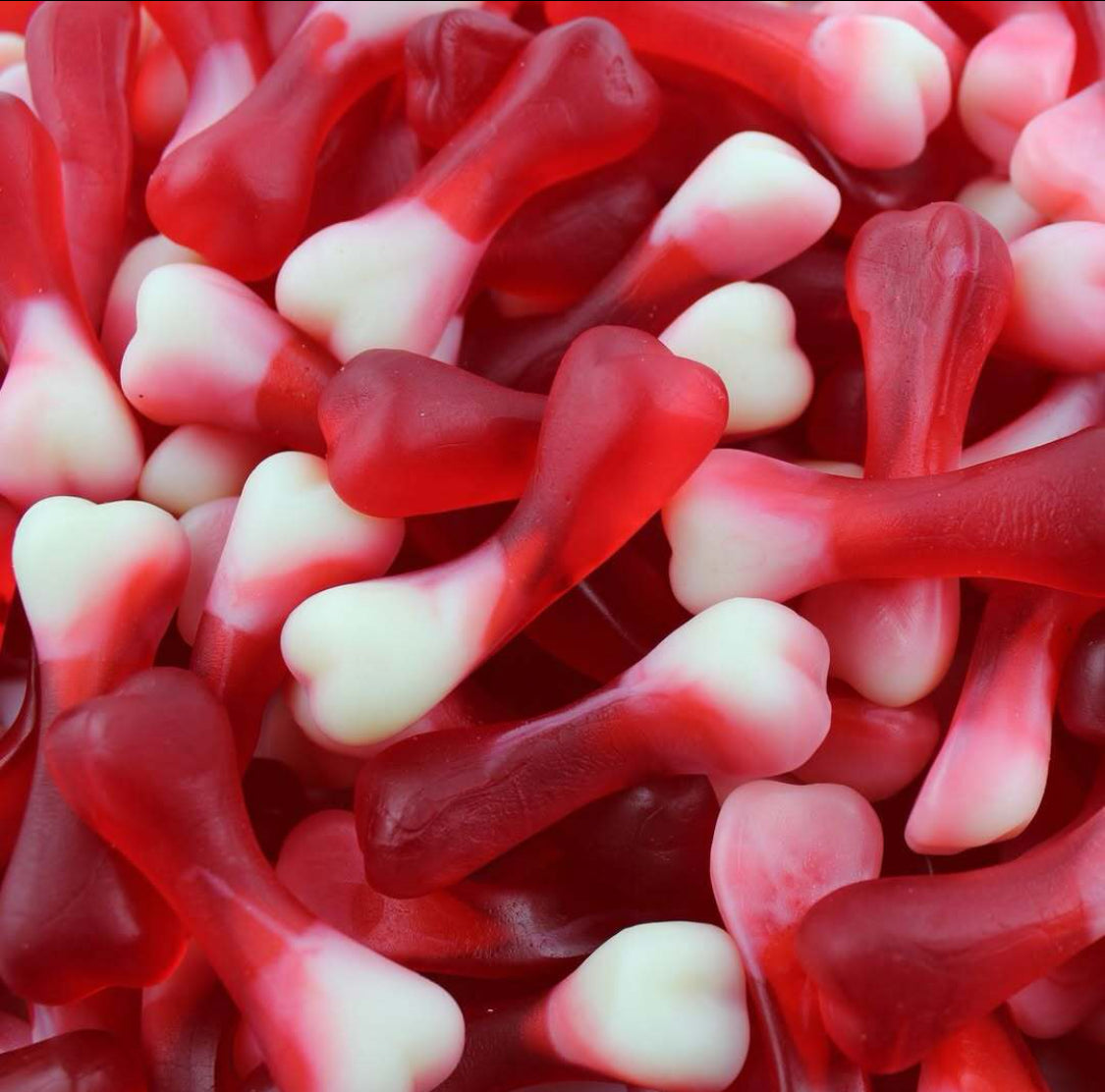 Découvrez l'Os Lisse : des bonbons en forme d'os rouge et blanc, parfum fraise. Sachet de 1kg pour une expérience gourmande à savourer sans modération !