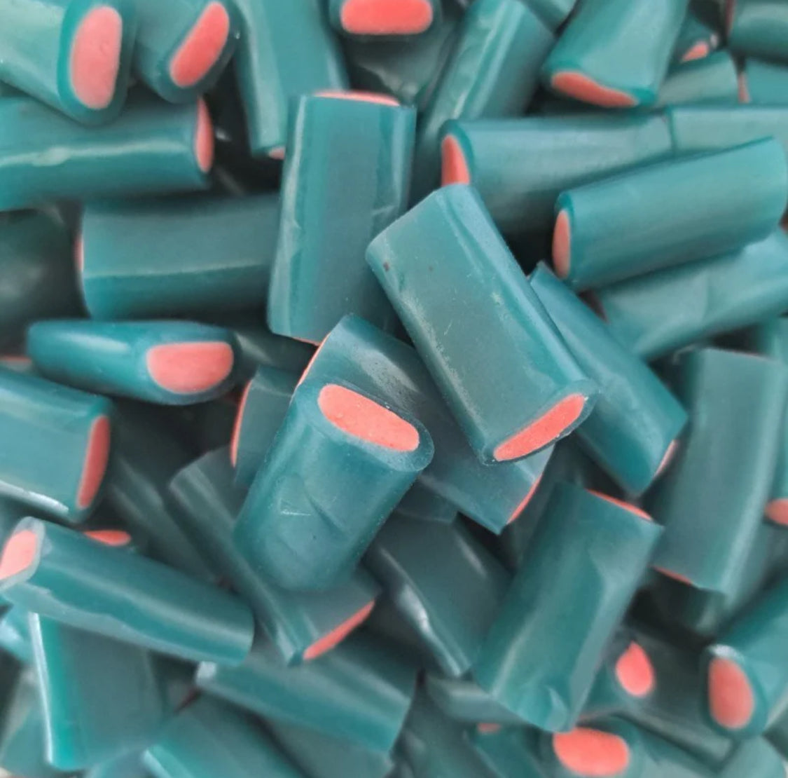 Bonbons gélifiés goût redbull en forme de mini bâtons halal avec enrobage bleu et garniture rose tendres.